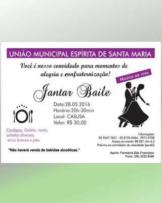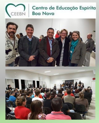 O documento relata a visita do médium Divaldo Franco à cidade de Santa Maria no Rio Grande do Sul. Ele deu uma palestra sobre transtornos psiquiátricos e obsessivos para um público de aproximadamente 4.500 pessoas. O documento também menciona eventos e atividades de outras sociedades espíritas locais como exposições doutrinárias e palestras.