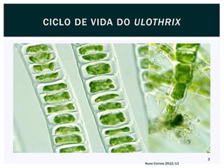 O documento apresenta os ciclos de vida de vários organismos, incluindo Ulothrix, Spirogyra, Chlamydomonas, Fucus vesiculosus e Ulva. Descreve as características de cada ciclo de vida, tais como a alternância de fases nucleares, a presença ou ausência de alternância de gerações, e se o ciclo de vida é haplonte, diplonte ou haplodiplonte. Inclui também imagens ilustrando os diferentes estágios dos ciclos de vida.