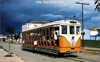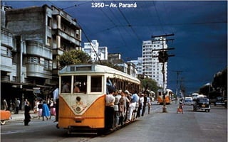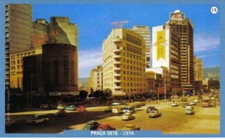O documento apresenta uma cronologia de importantes construções e transformações urbanas em uma cidade brasileiras entre 1902 e 1950, destacando locais como praças, avenidas e igrejas. Ele menciona revisões de infraestrutura, como a demolição de edifícios para novos projetos e o desenvolvimento de transportes públicos, incluindo bondes. A narrativa ilustra a evolução arquitetônica e urbana da cidade ao longo do tempo.