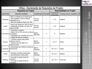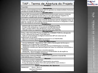 O documento apresenta um projeto de fornecimento de conectividade sem fio gratuita na cidade de Belo Horizonte patrocinado pela prefeitura. Detalha os orçamentos e locais aprovados para instalação das antenas, as atividades durante o horário comercial e o estudo das condições climáticas. Apresenta também as restrições e metas do projeto, incluindo limites de ruído, altura das antenas, velocidade da internet, percentual da população a ser atingida e custo máximo.