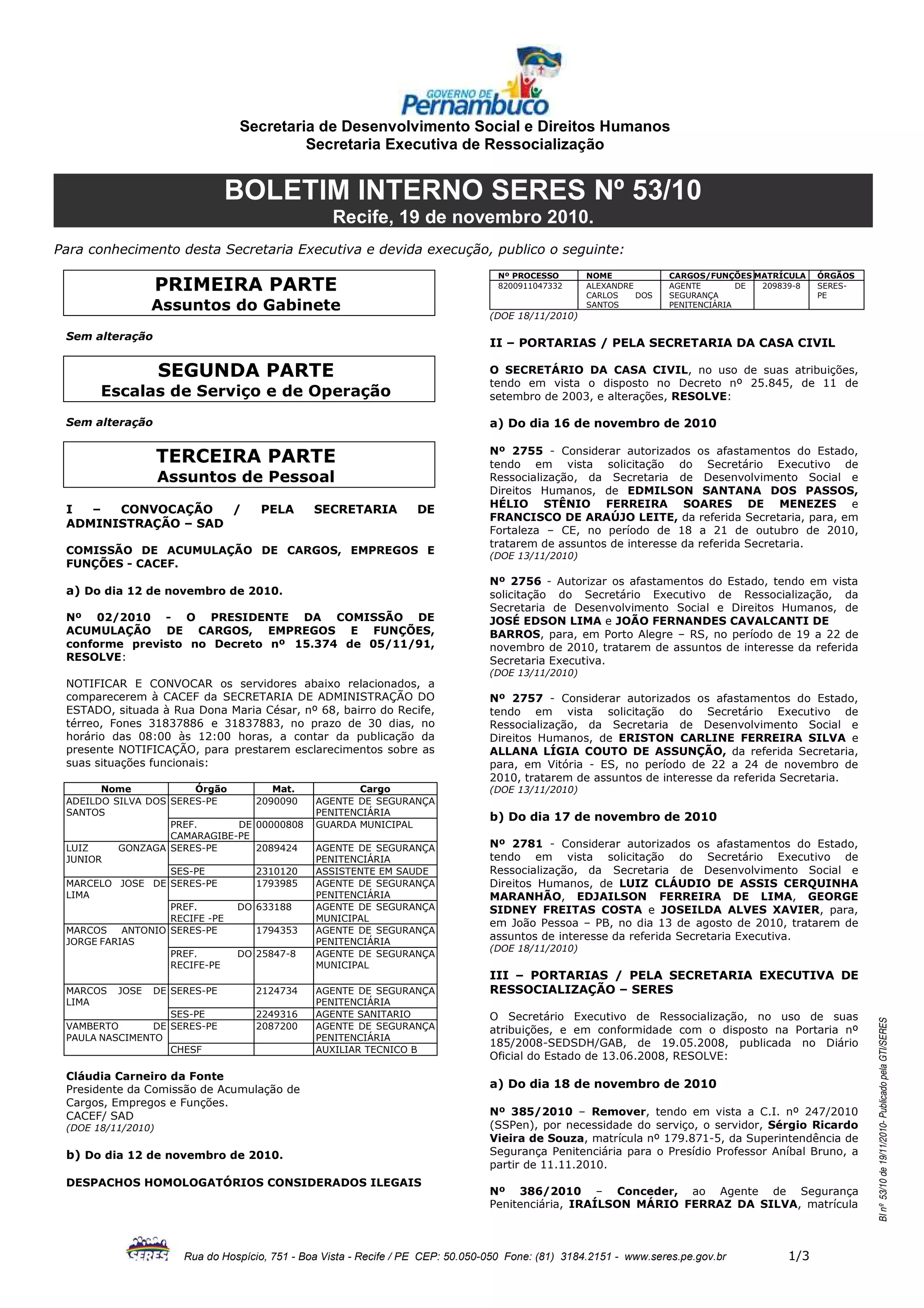 O boletim interno da Secretaria de Desenvolvimento Social e Direitos Humanos anuncia convocações, afastamentos, transferências e contratos. É notificado um grupo de servidores para prestarem esclarecimentos sobre suas situações funcionais à Comissão de Acumulação de Cargos. São autorizados afastamentos para tratar de assuntos da secretaria em outros estados. Há ratificação de dispensa de licitação e publicação de extratos de contratos e termos aditivos.
