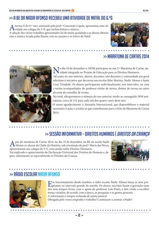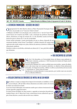 Este boletim informativo descreve várias atividades realizadas nas bibliotecas escolares do Agrupamento de Escolas Dr. Júlio Martins, incluindo sessões de literacia financeira, encontros de leitura, oficinas de árvores de Natal, apresentações sobre direitos humanos e mais.