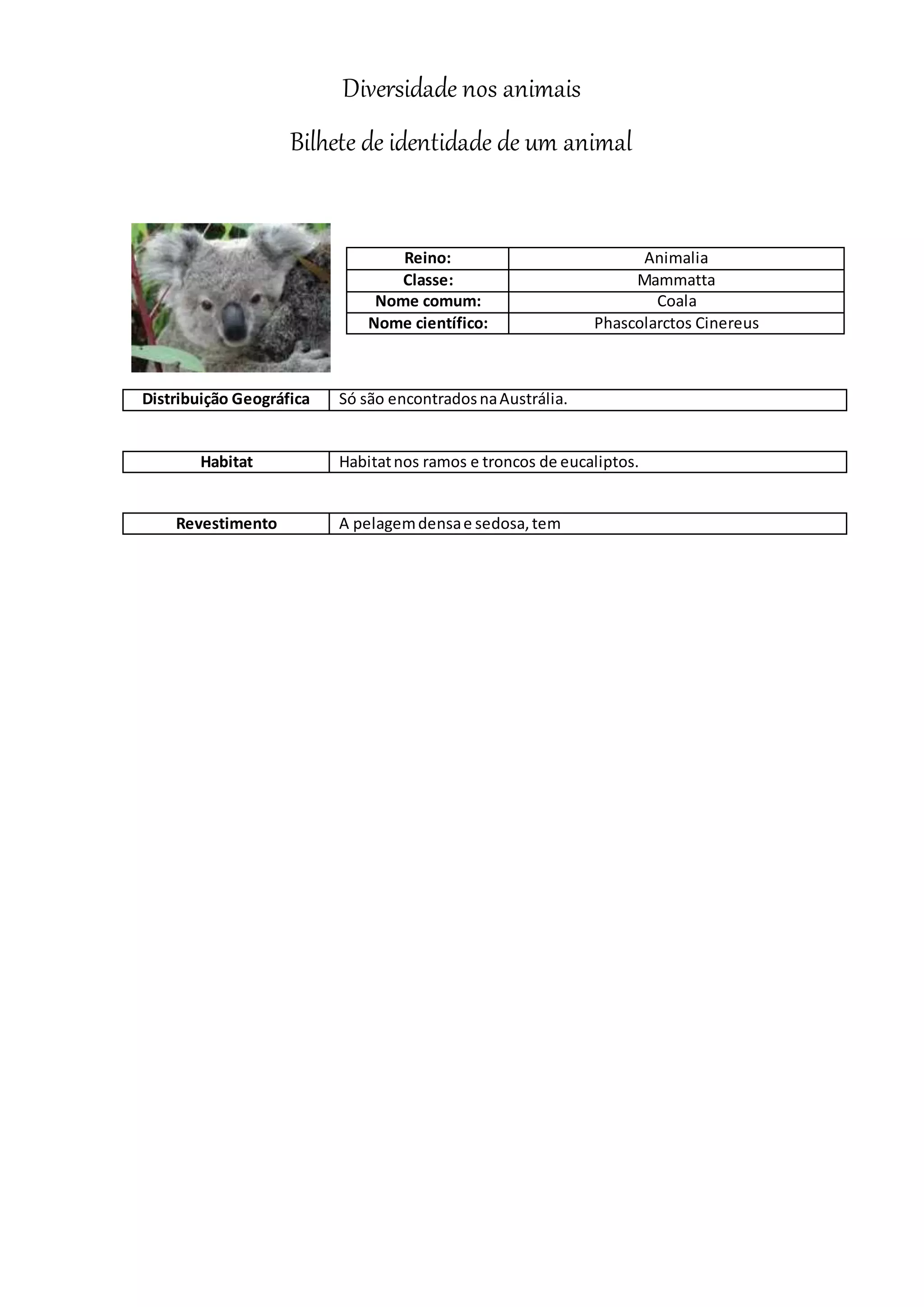 O documento descreve o coala, um mamífero encontrado apenas na Austrália que vive nos ramos e troncos de eucaliptos e tem uma pelagem densa e sedosa. Pertence ao reino Animalia e à classe Mammalia, com nome comum de coala e nome científico de Phascolarctos Cinereus.