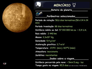 O documento fornece informações sobre os planetas do Sistema Solar, incluindo Mercúrio, Vênus, Terra, Marte, Júpiter, Saturno, Urano, Netuno e Plutão. Para cada planeta, são fornecidos parâmetros como período de rotação, distância ao Sol, temperatura média e composição atmosférica. Além disso, são apresentados dados sobre as viagens espaciais noturnas para cada planeta, como a distância percorrida e o tempo gasto para chegar lá.