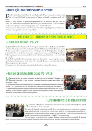 O documento resume várias atividades realizadas nas bibliotecas escolares do Agrupamento de Escolas Dr. Júlio Martins. Inclui projetos de saúde oral, atividades de articulação entre ciclos, partilha de leituras, concursos de leitura e sugestões de livros.