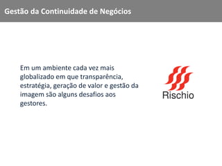O documento discute os desafios da gestão da continuidade de negócios em ambientes globalizados, propondo uma abordagem baseada em resiliência que integra avaliação de riscos, análise de impacto e ciclo de vida da gestão de continuidade. A empresa Rischio oferece uma plataforma unificada para apoiar as organizações a alcançarem maturidade nessa gestão e aumentar sua competitividade e resiliência aos riscos dos negócios.