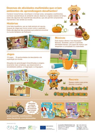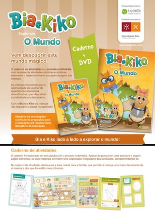 O documento apresenta um caderno de atividades e um produto multimídia que visam estimular o desenvolvimento infantil através de experiências educativas diversificadas. A proposta inclui atividades lúdicas, músicas e jogos que incentivam a exploração e a criatividade das crianças, abordando temas como cores, sensações e características do ambiente. Além disso, o material está alinhado com as orientações curriculares para a educação pré-escolar do Ministério da Educação.