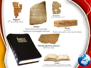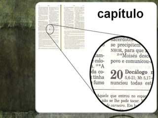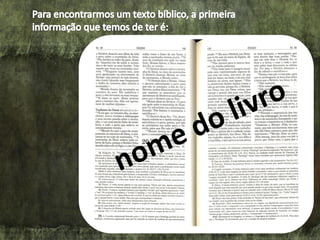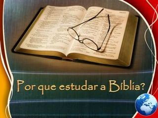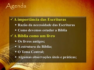 O documento discute: 1) A importância e necessidade de estudar as Escrituras; 2) Os diferentes formatos e materiais usados para escrever a Bíblia antigamente, como papiro e pergaminho; 3) A estrutura e organização dos livros da Bíblia.