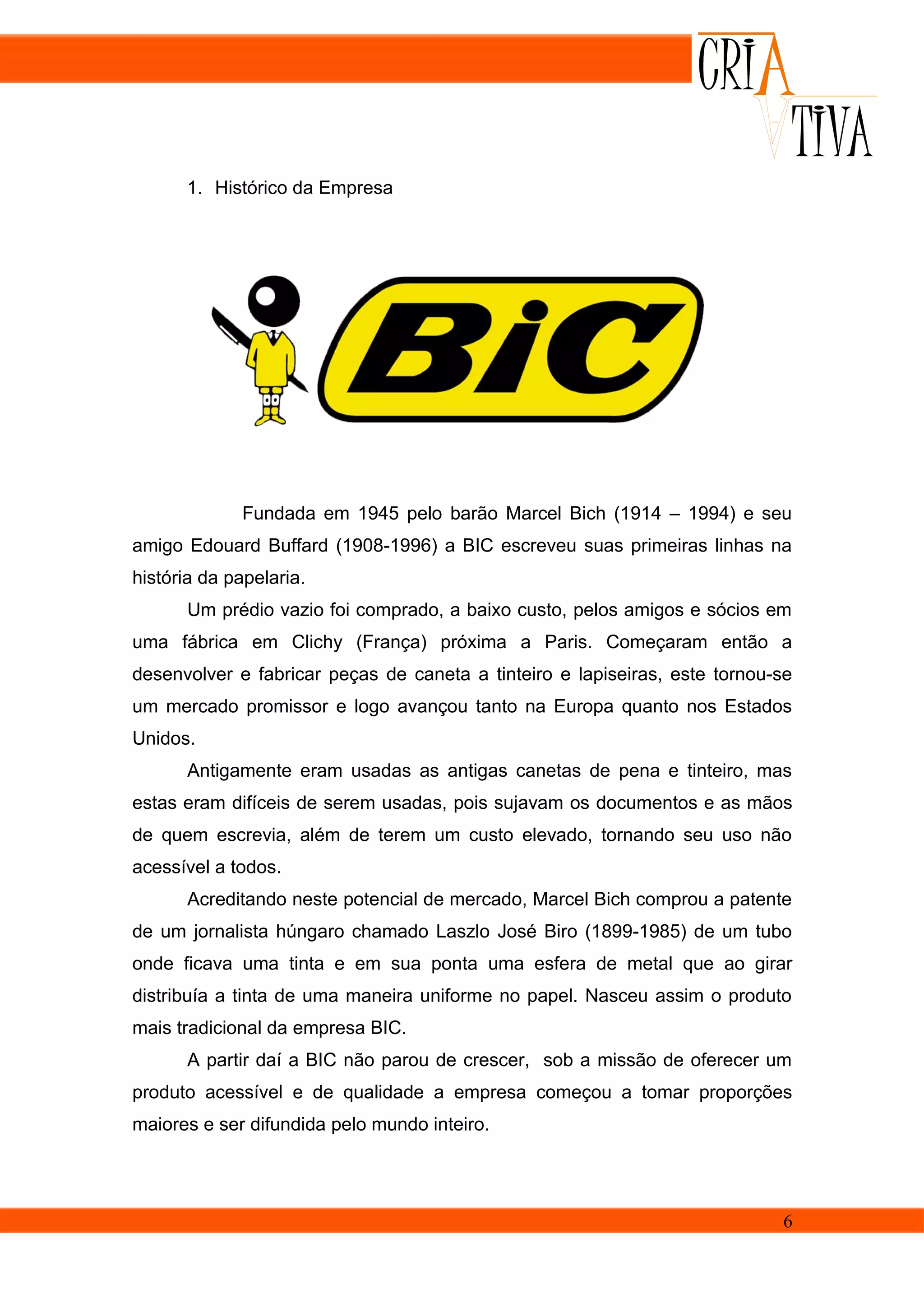 1) A BIC foi fundada em 1945 na França por Marcel Bich e Edouard Buffard para produzir canetas esferográficas mais baratas e práticas que as canetas de tinteiro da época.