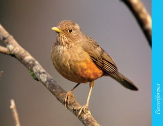 O documento descreve diversas espécies de aves brasileiras, fornecendo informações sobre suas características, habitat e importância ecológica. As aves descritas incluem o sabiá-laranjeira, sabiá-barranco, sabiá-coleira, araponga, tangará, canário-da-terra, coleiro-do-brejo e bigodinho. Todas essas espécies se alimentam de frutos e insetos, dispersando sementes e contribuindo para a manutenção da biodiversidade local.