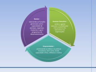 O documento discute as competências necessárias para um profissional de secretariado executivo moderno. A profissão evoluiu para exigir habilidades gerenciais e de liderança, além de conhecimentos em finanças, marketing e idiomas. Uma postura ética, boa comunicação e capacidade de adaptação às mudanças tecnológicas são essenciais para o sucesso na carreira atual.