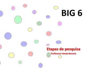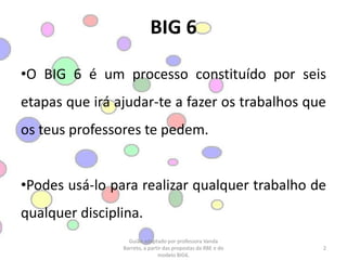 O documento descreve o BIG 6, um processo de seis etapas para pesquisa e produção de trabalhos escolares. As seis etapas são: 1) Definição da tarefa, 2) Procura de informação, 3) Localização e acesso à informação, 4) Uso da informação, 5) Produção do trabalho, 6) Autoavaliação do trabalho. O documento fornece orientações detalhadas para cada etapa do processo BIG 6.