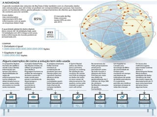 O documento discute o conceito de Big Data, definindo-o como conjuntos extremamente grandes de dados que precisam de ferramentas especializadas para lidar com volumes e velocidades crescentes. Explica que o Big Data pode ser usado para inovação e tomada de decisão, e destaca o crescimento exponencial na geração de dados oriundo da internet e dispositivos móveis. Também aborda profissões emergentes e soluções tecnológicas para o armazenamento e análise de grandes volumes de dados.