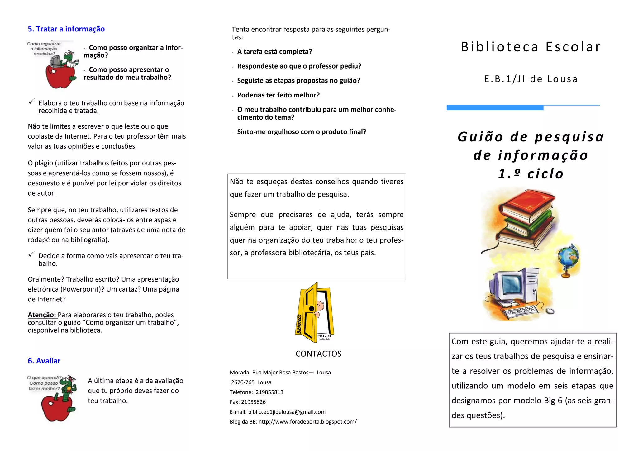 Este documento apresenta um guia para a realização de trabalhos de pesquisa utilizando o modelo Big 6, que consiste em 6 etapas: 1) identificar o tema, 2) procurar informação, 3) selecionar documentos, 4) recolher informação, 5) organizar e apresentar os resultados, 6) avaliar o trabalho. O guia fornece conselhos sobre cada etapa do processo de pesquisa.
