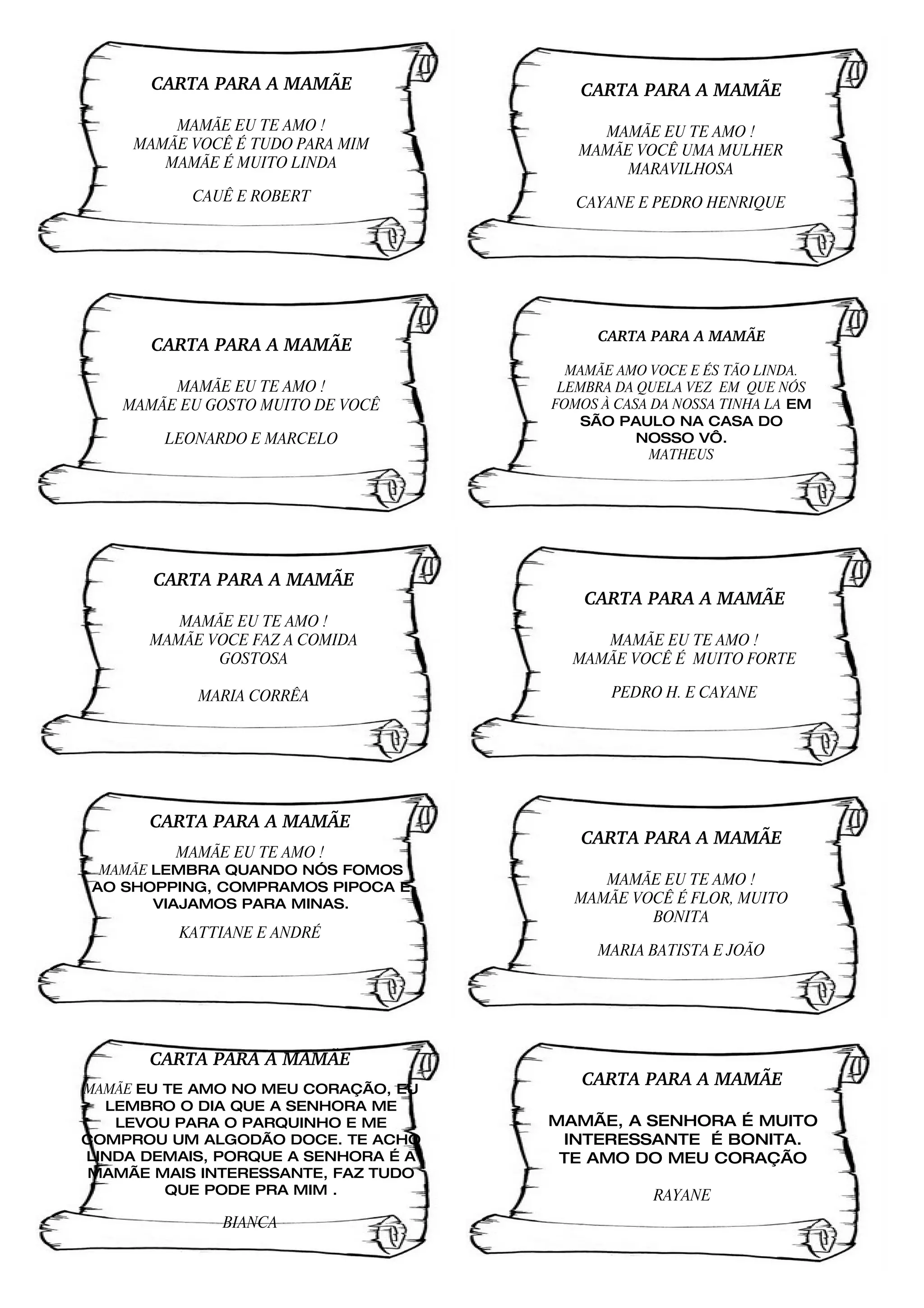 As cartas para as mães expressam amor e gratidão. As crianças elogiam suas mães por serem lindas, fortes, interessantes e por fazerem comidas deliciosas. Elas também lembram momentos especiais compartilhados com as mães.
