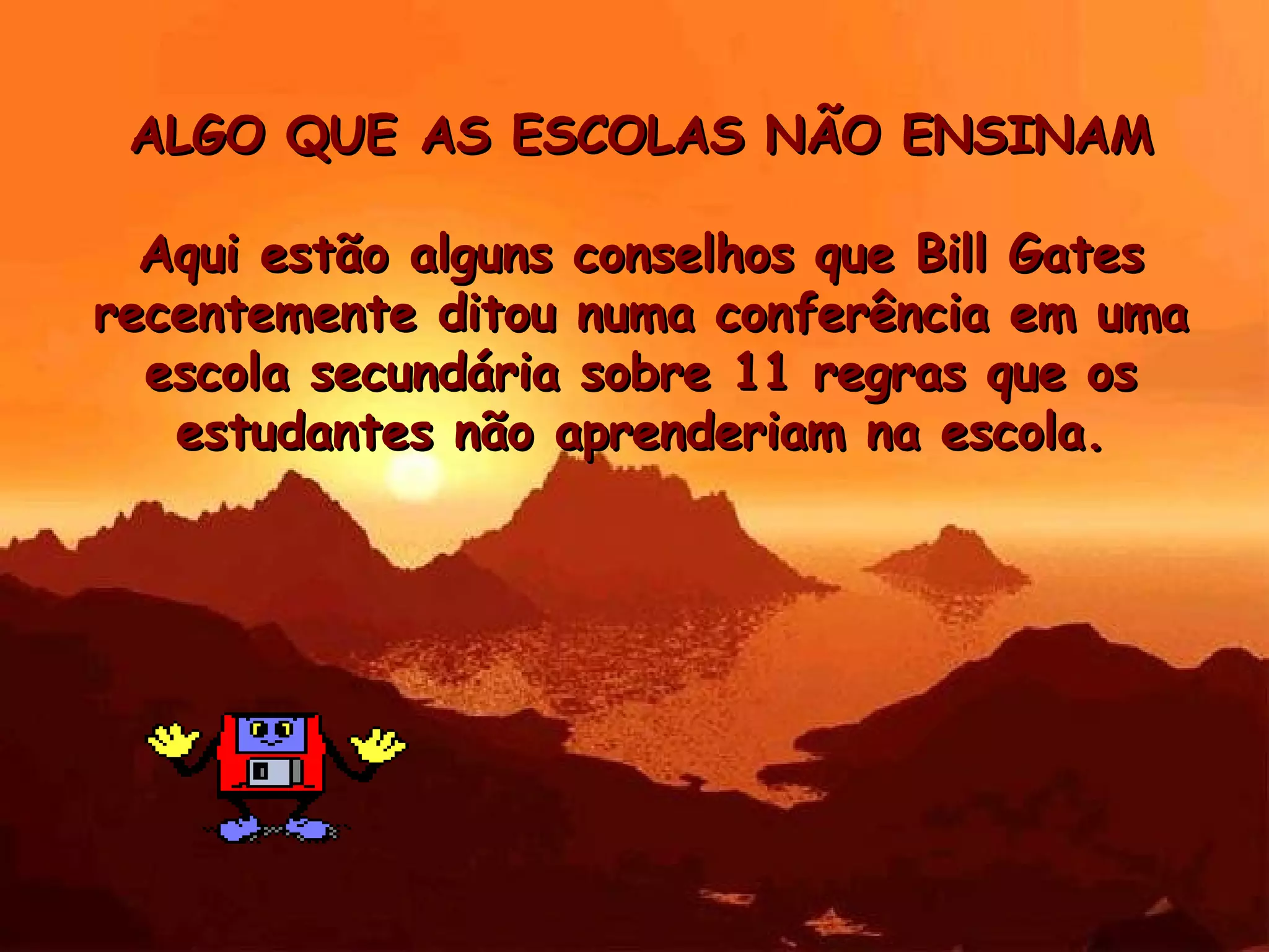 Bill Gates deu 11 regras que as escolas não ensinam sobre a vida real. As regras incluem que a vida não é fácil, o mundo não se importa com sua autoestima e você provavelmente não ganhará muito dinheiro logo após se formar. Ele também disse que a vida não é dividida em semestres e que a televisão não retrata a vida real.