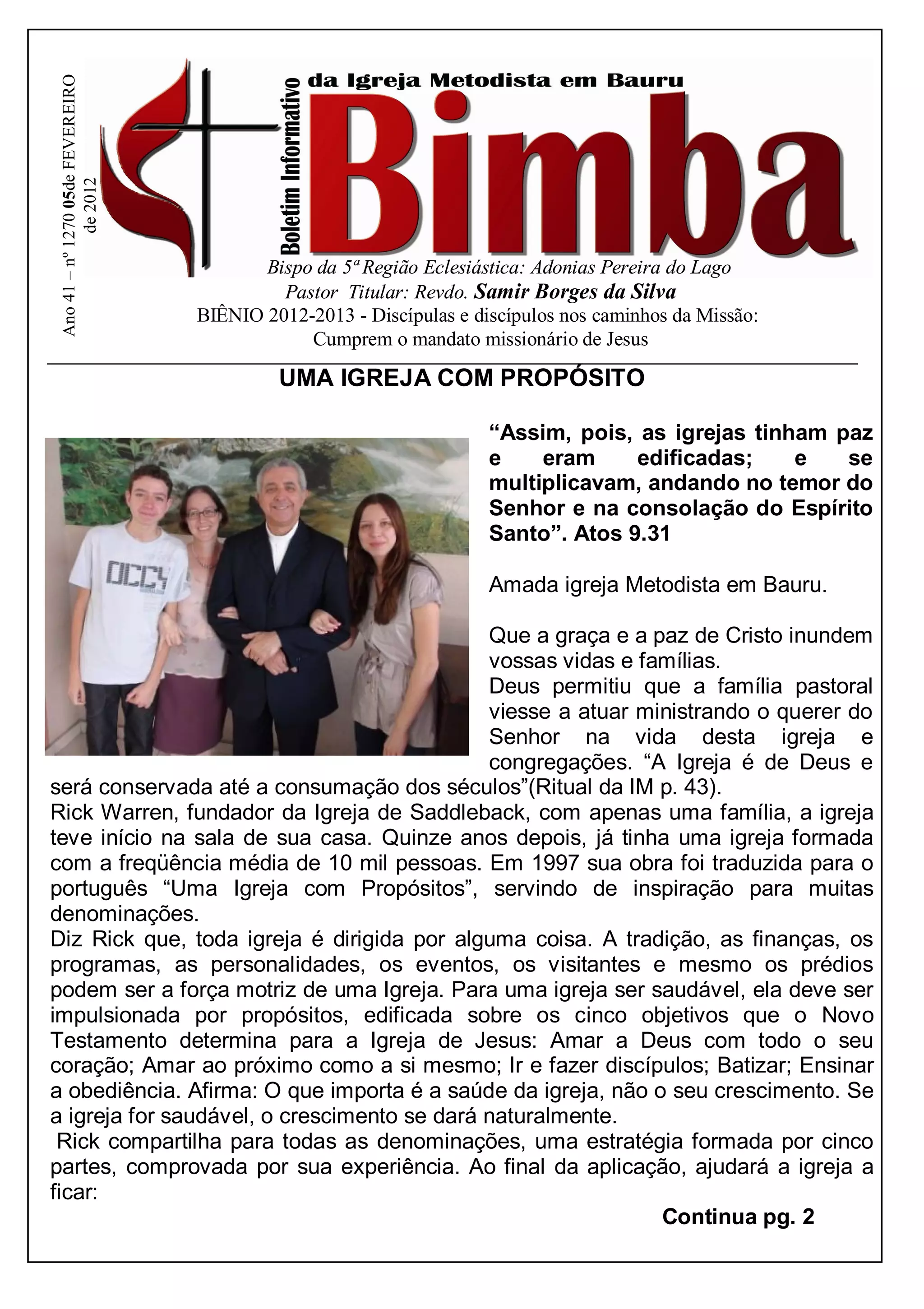 O documento resume as atividades e anúncios da Igreja Metodista em Bauru para o mês de fevereiro de 2012, incluindo: 1) saudação do pastor e tema para o ano; 2) resumo do livro "Uma Igreja com Propósitos"; 3) posse dos oficiais eleitos para 2012-2013.