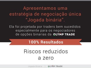 O documento descreve uma estratégia de negociação de opções binárias chamada "Jogada Binária" que aproveita movimentos nos preços causados por notícias econômicas importantes. A estratégia envolve abrir posições em alta e baixa logo antes das notícias e fechar a posição perdedora rapidamente para garantir lucros. Recomenda-se usar esta estratégia para os principais pares de moedas envolvendo o dólar americano e transações de 10 minutos de prazo.