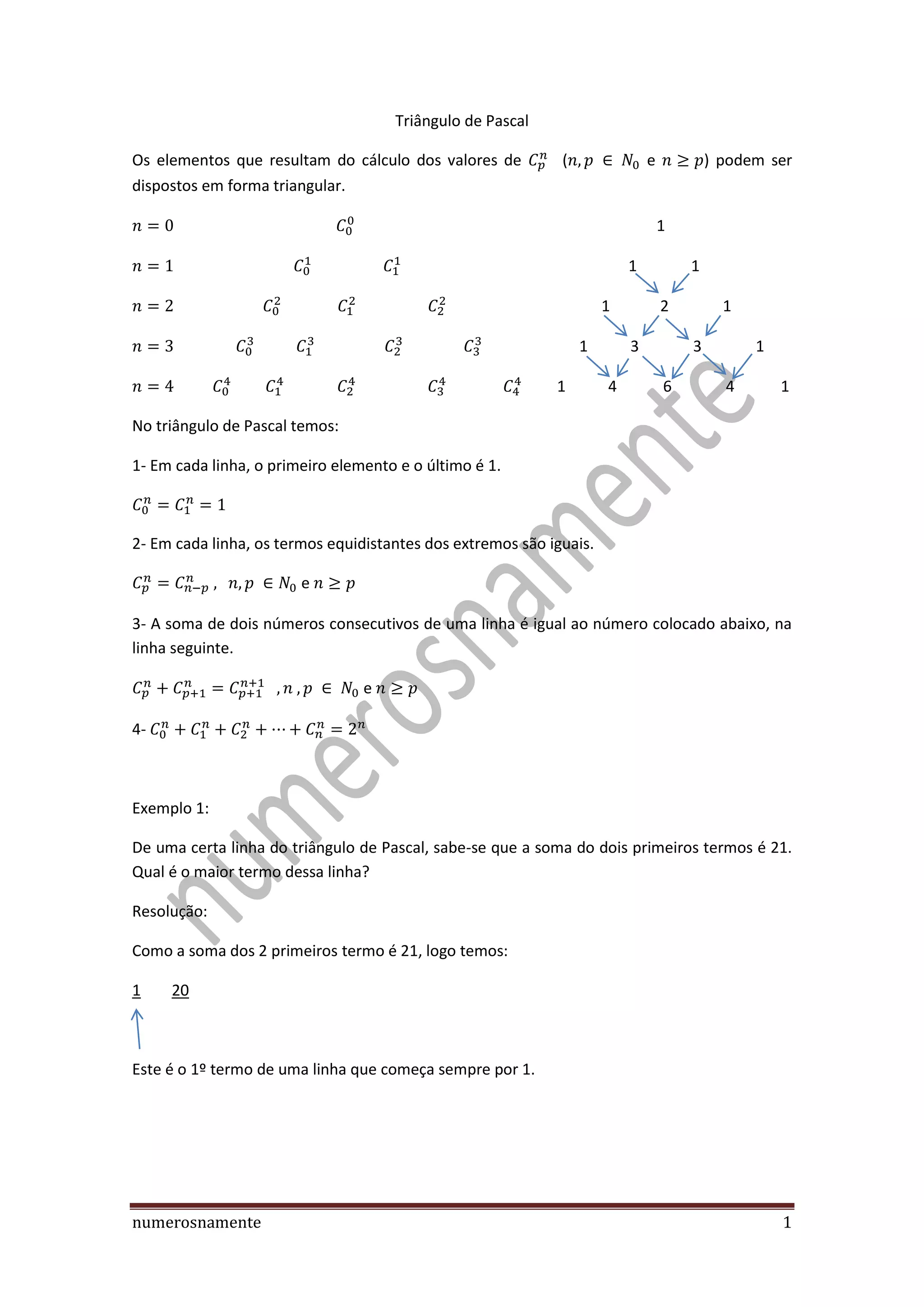 1) O documento discute o Triângulo de Pascal, no qual os elementos são dispostos em forma triangular de acordo com fórmulas matemáticas.