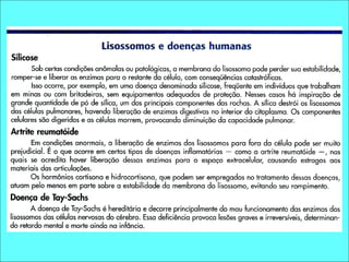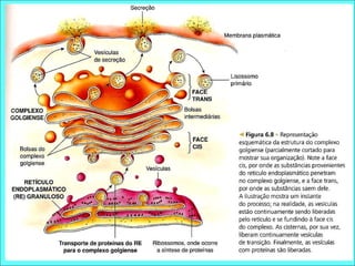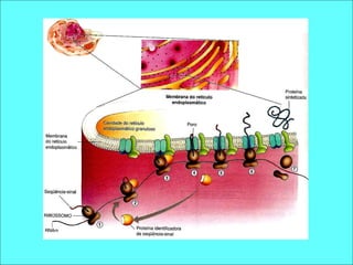 O documento descreve as estruturas e organelas encontradas no citoplasma das células eucarióticas, incluindo o citoesqueleto, ribossomos, centríolos, retículo endoplasmático, complexo de Golgi, lisossomos e peroxissomos. Detalha as funções do retículo endoplasmático granuloso e não-granuloso e do complexo de Golgi na síntese e transporte de proteínas. Explica também as funções dos lisossomos e peroxissomos na digestão e desintox