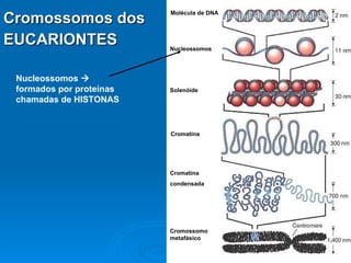 O documento descreve a estrutura e função dos cromossomos em eucariontes. Resume que o DNA se organiza em cromatina e cromossomos visíveis durante a metafase, e que o número de cromossomos varia entre espécies, sendo constante dentro de cada espécie.