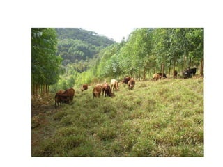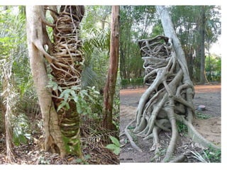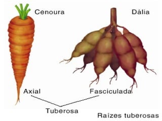 O documento descreve diferentes tipos de raízes e suas funções, incluindo raízes tuberosas para armazenamento de reservas, raízes fasciculadas para suporte, raízes estrangulantes em plantas trepadeiras, raízes tabulares em figueiras, e raízes sugadoras ou haustórios em plantas parasitas. Também descreve diferentes tipos de caules como tronco, haste, colmo oco e cheio, e estolão.