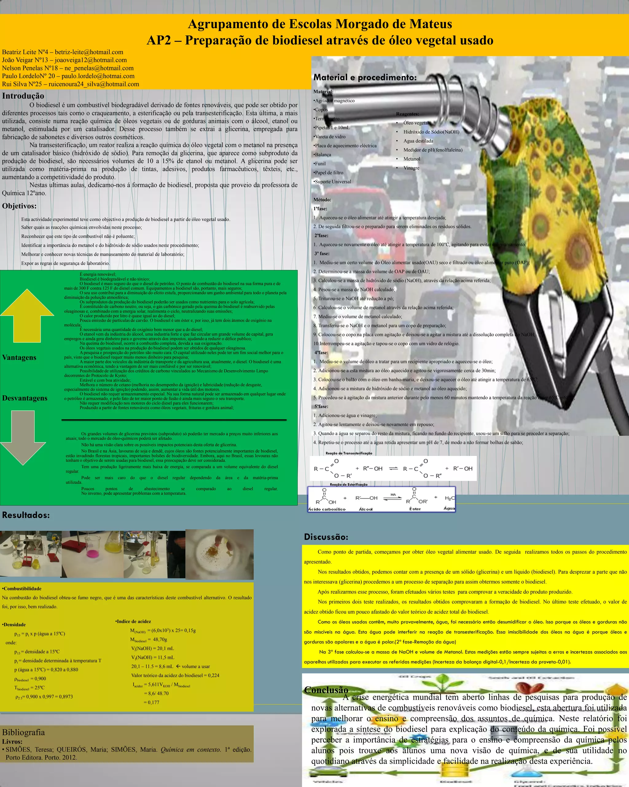 Este documento descreve os procedimentos e resultados de um experimento de produção de biodiesel a partir de óleo vegetal usado através do processo de transesterificação. O experimento foi realizado por um grupo de estudantes e teve como objetivo principal produzir biodiesel e compreender as reações químicas e etapas envolvidas no processo. Os alunos realizaram vários testes nos resultados finais para verificar a formação do biodiesel.