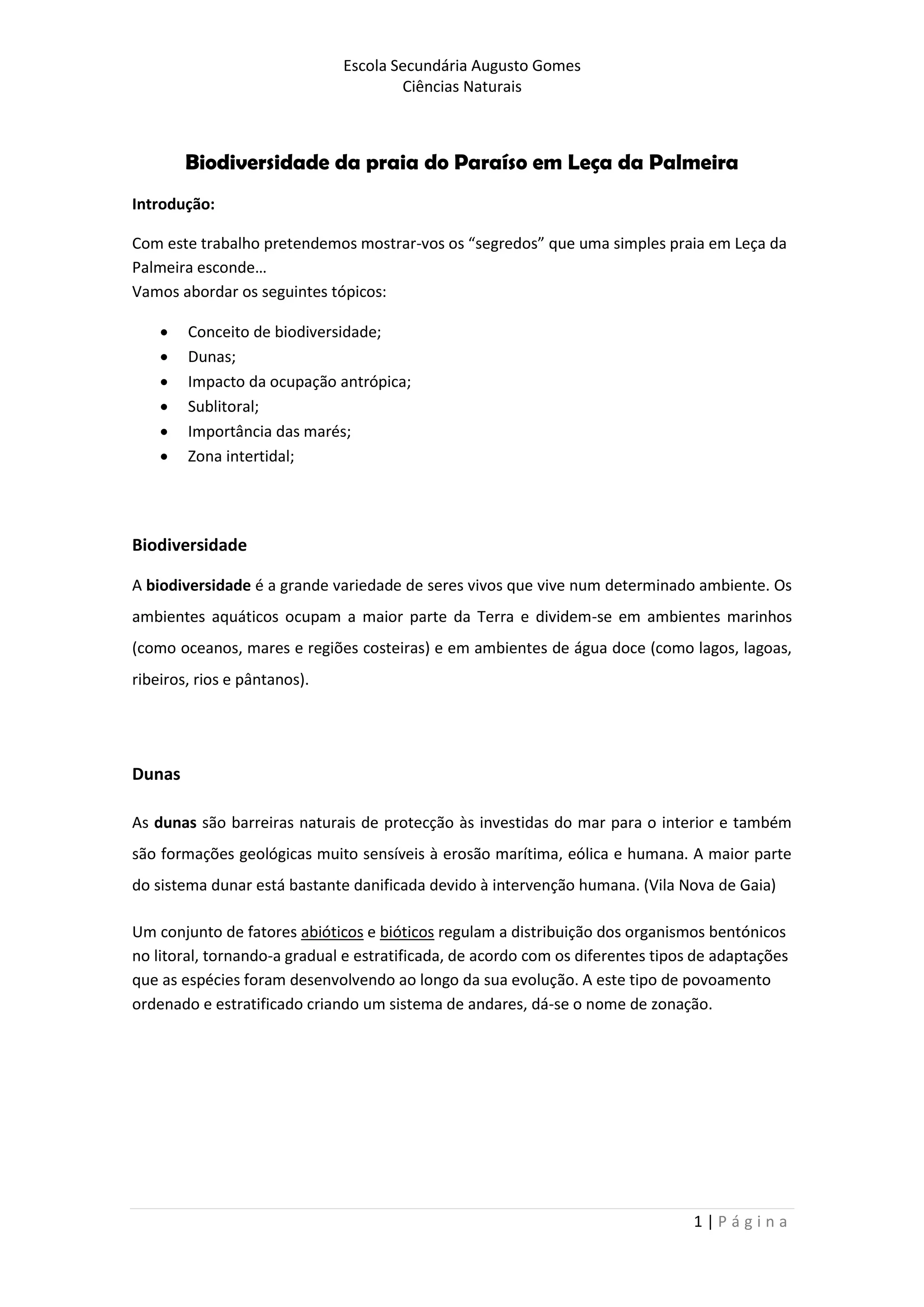 O documento discute a biodiversidade da praia do Paraíso em Leça da Palmeira, Portugal. Aborda conceitos como biodiversidade, dunas, zonas intertidal e sublitoral, e descreve as espécies encontradas nestas zonas, incluindo algas, moluscos e crustáceos.
