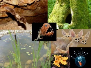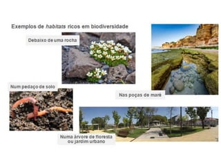 O documento discute a vida na Terra. Ele explica que a Terra tem água líquida, temperaturas amenas e uma atmosfera protetora que tornam possível a vida. A biodiversidade é definida como a variedade de seres vivos em um ecossistema. Ambientes aquáticos como água doce e salgada e terrestres como planícies e cavernas são discutidos como abrigando vida. Biosfera, litosfera, hidrosfera e atmosfera são introduzidos como camadas do planeta.