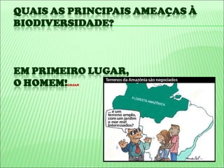 O documento discute a importância da biodiversidade e as principais ameaças a ela, como desmatamento, poluição, exploração excessiva de espécies e introdução de espécies invasoras. Ele destaca que o Brasil é considerado um país de megadiversidade e que ações sustentáveis são necessárias para reverter o declínio da biodiversidade e dos ecossistemas.