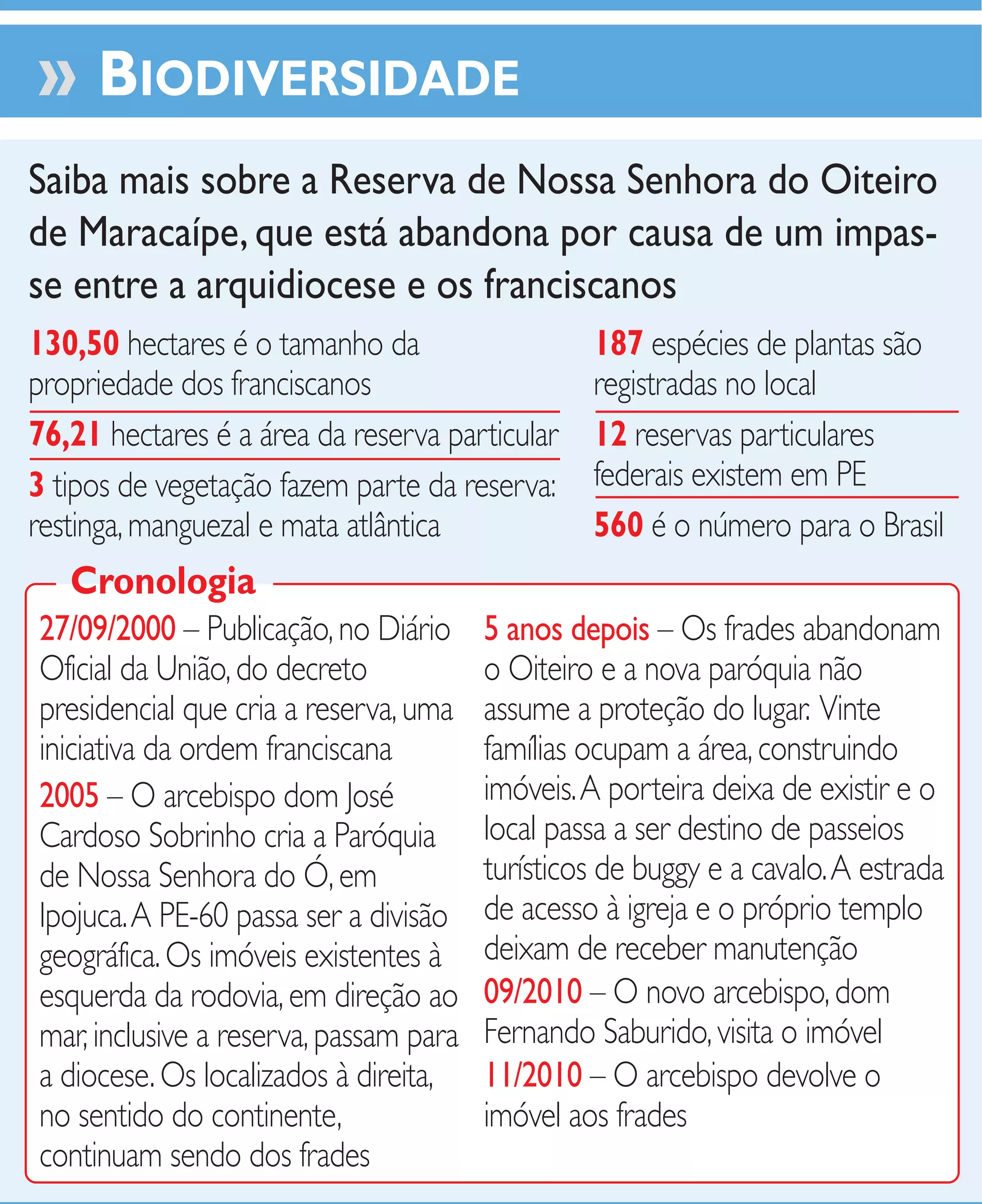 A reserva de Nossa Senhora do Oiteiro de Maracaípe, em Pernambuco, possui 130,5 hectares e abriga 187 espécies de plantas, incluindo restinga, manguezal e mata atlântica. Após ser criada como reserva particular federal em 2000, ela foi abandonada 5 anos depois quando os frades deixaram o local. Desde então, a área sofre com ocupações irregulares e falta de manutenção devido a um impasse entre a arquidiocese e os franciscanos sobre sua propriedade.