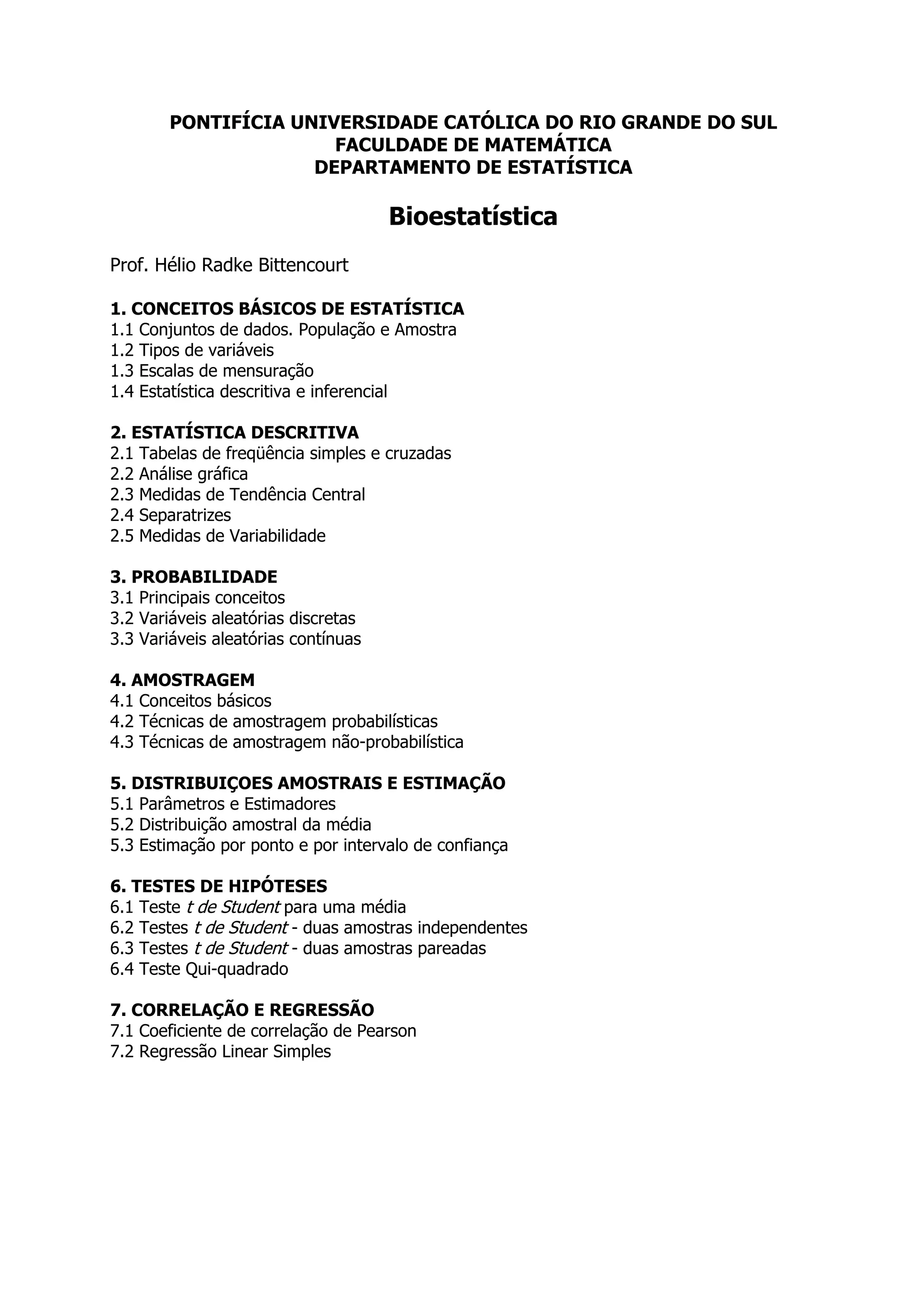 Este documento apresenta os principais tópicos de um curso de Bioestatística. Aborda conceitos básicos de estatística, estatística descritiva, probabilidade, amostragem, distribuições amostrais, testes de hipóteses, correlação e regressão. Inclui exemplos de tabelas, gráficos e conceitos importantes para cada tópico.