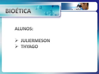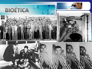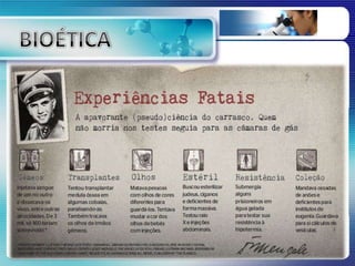 O documento discute a bioética e a ética médica ao longo da história, desde os códigos de Hamurabi e Hipócrates até experimentos nazistas e o Código de Nuremberg. Também aborda temas atuais polêmicos como clonagem, células-tronco e aborto.