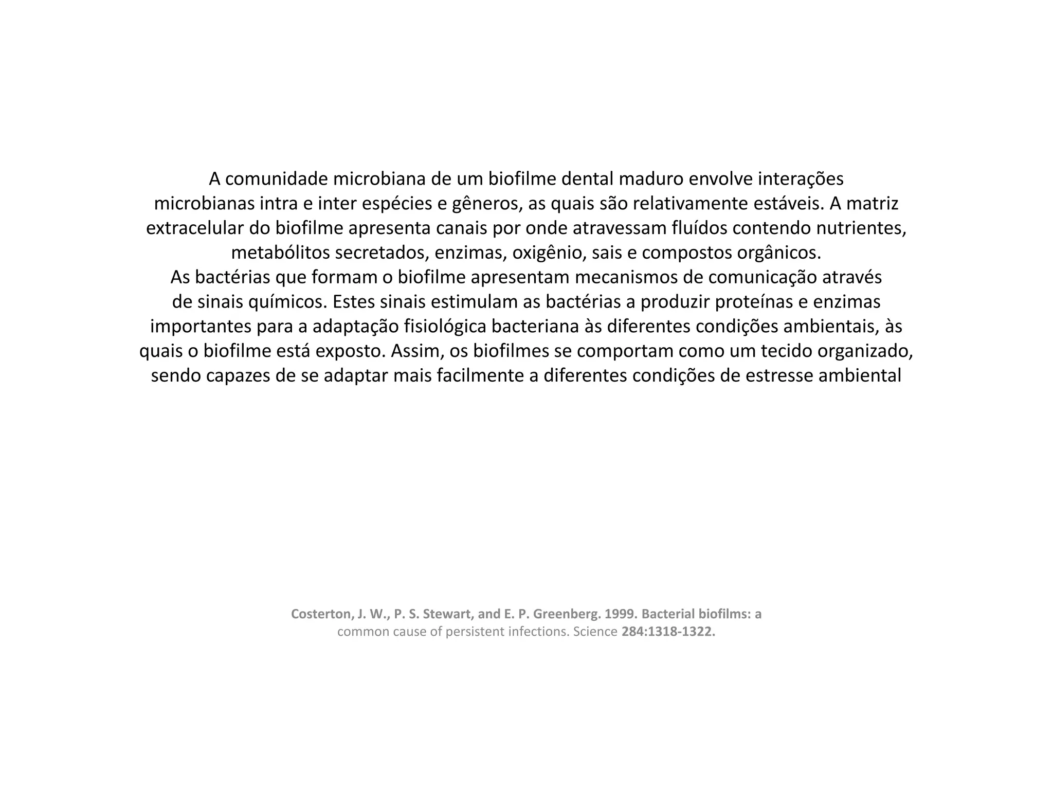 1) O biofilme dental é formado por uma comunidade microbiana complexa que envolve interações entre diferentes espécies bacterianas.