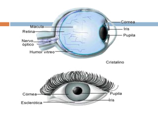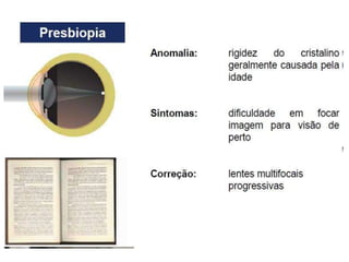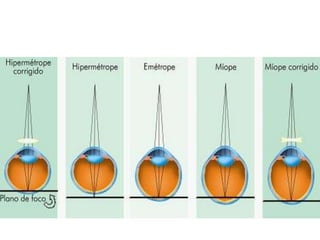 O documento descreve a anatomia e fisiologia da visão humana. Ele discute os principais componentes do olho como a córnea, íris, cristalino e retina, e processos como a formação de imagem, adaptação e acomodação visual. Também aborda defeitos de visão como miopia, hipermetropia, astigmatismo e estrabismo.