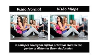 O documento descreve os principais conceitos da biofísica da visão, incluindo como a luz é processada pelo olho humano. A luz é tratada como onda e fóton, e é refratada pelas lentes do olho antes de formar imagens na retina. Vários fenômenos ópticos como reflexão, refração e difração são explicados. As anomalias de visão como miopia, hipermetropia e astigmatismo também são resumidas.