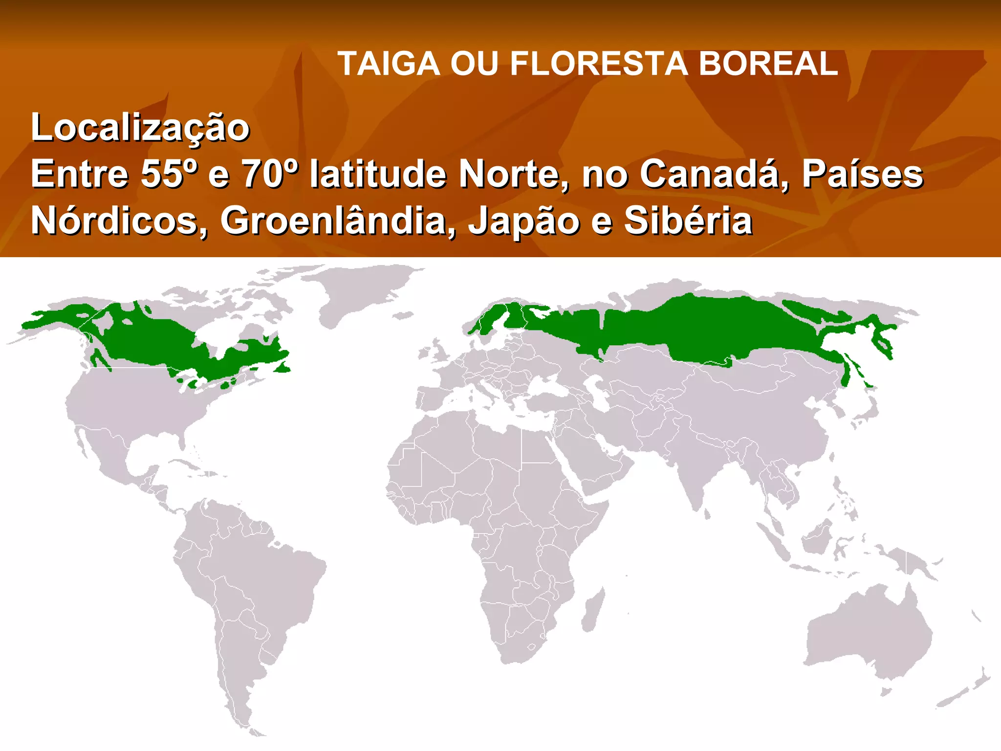 A taiga ou floresta boreal se localiza entre 55° e 70° Norte, em áreas frias com longos invernos e curtos verões. É composta principalmente por coníferas perenes como pinheiros e abetos, e contém pântanos, lagos e uma variedade de animais como alces, ursos e lobos. Acima da linha de árvores, encontra-se a tundra alpina com plantas adaptadas a geadas noturnas.