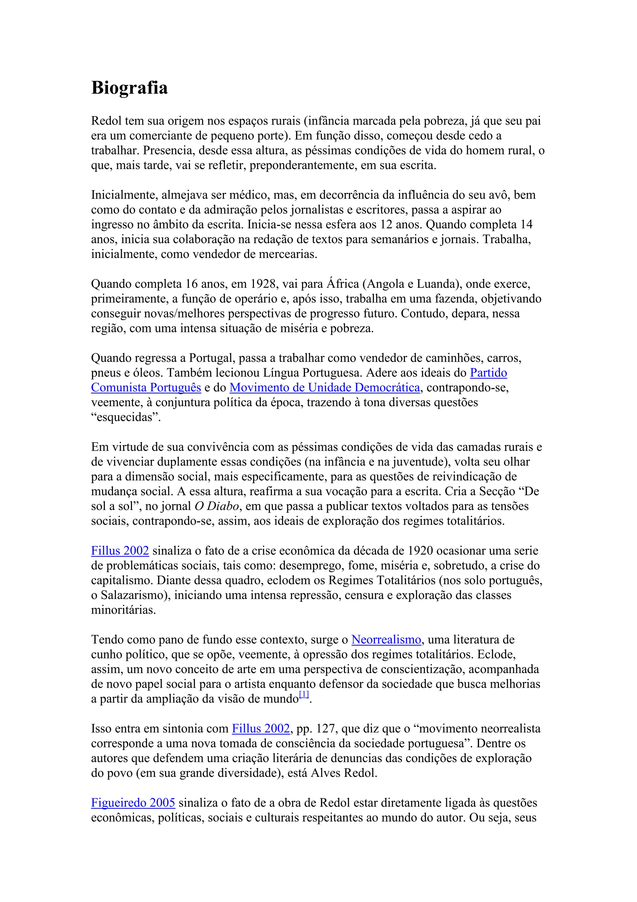 Este documento descreve a biografia e obra do escritor português Alves Redol. Redol nasceu em uma família pobre no meio rural e testemunhou desde cedo as difíceis condições de vida no campo, o que influenciou fortemente sua escrita posterior. Ele se envolveu com o jornalismo e o Partido Comunista Português e se opôs veementemente ao regime autoritário de Salazar. Suas obras criticavam a exploração e a miséria da população rural e urbana durante o Estado Nov