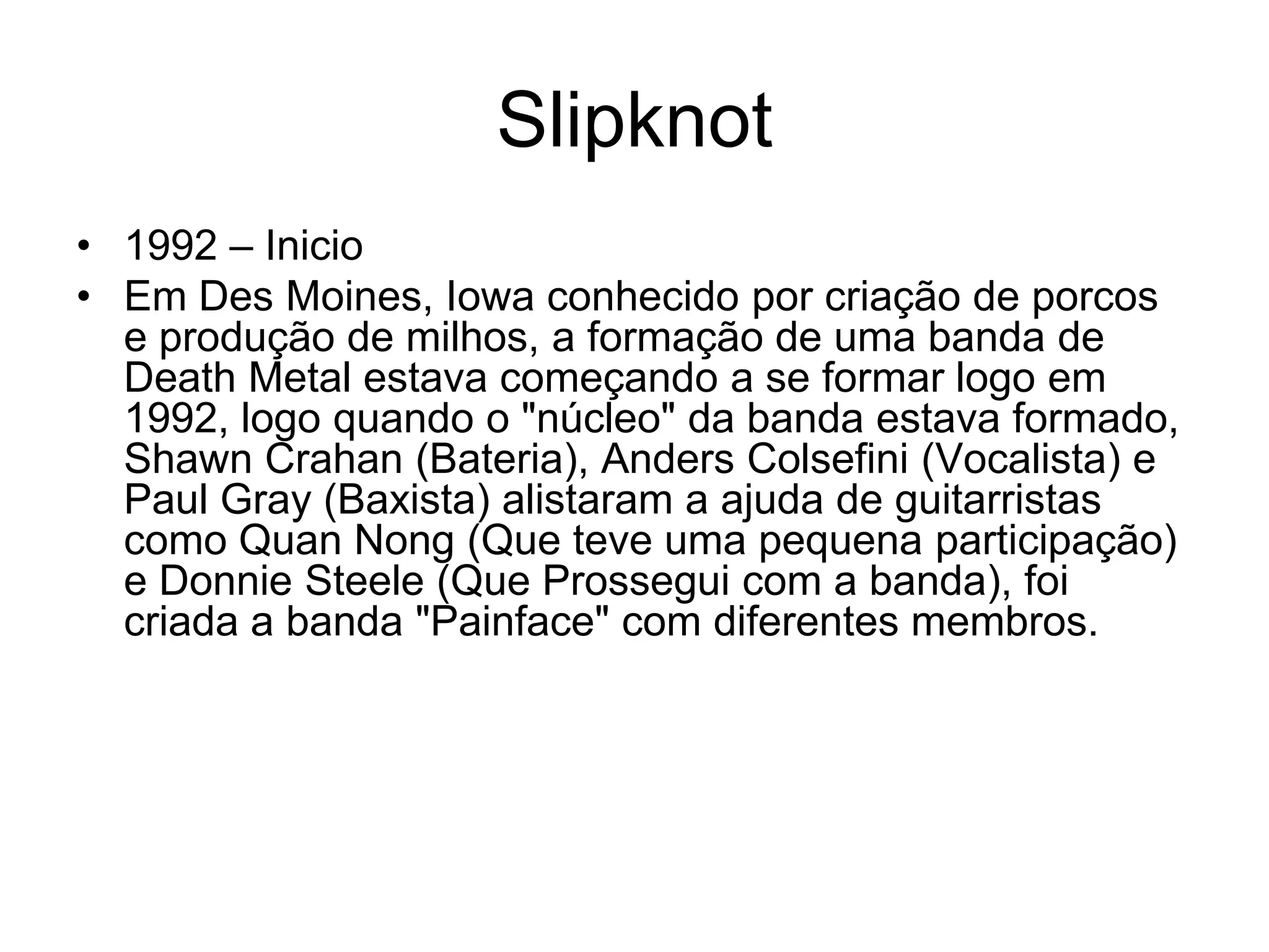 Em 1992, baterista Shawn Crahan, vocalista Anders Colsefini e baixista Paul Gray formaram a banda de death metal Painface em Des Moines, Iowa, recrutando inicialmente os guitarristas Quan Nong e Donnie Steele. A banda teve diferentes membros em seus estágios iniciais.