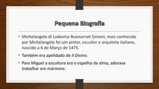 Miguel Ângelo foi um dos maiores artistas do Renascimento Italiano, trabalhando como pintor, escultor e arquiteto. Sua obra-prima foi o afresco do teto da Capela Sistina, no qual ele pintou centenas de figuras bíblicas. Miguel Ângelo também era conhecido por suas esculturas realistas em mármore, como Pietà e Davi. Ele passou a vida aprimorando suas habilidades artísticas e se dedicando plenamente à sua arte.