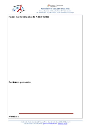 O documento fornece informações sobre o Agrupamento de Escolas Dr.a Laura Ayres, que inclui várias escolas de ensino básico e secundário em Quarteira, com a Escola Secundária Dra Laura Ayres servindo como a escola sede. Ele lista os nomes e endereços das escolas que fazem parte do agrupamento e fornece detalhes de contato.