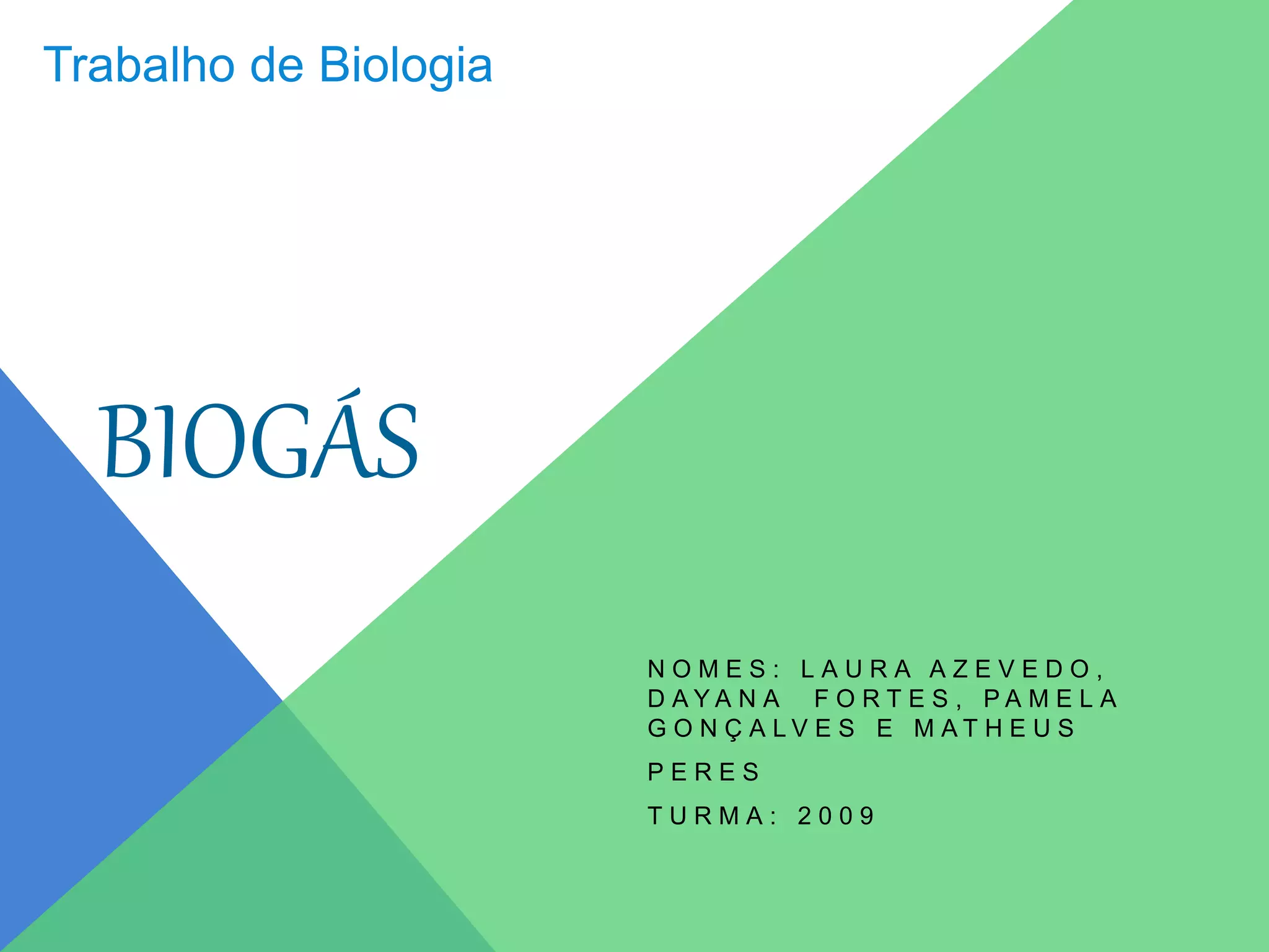 O documento descreve o que é biogás, como funciona um biodigestor e suas aplicações, principalmente no meio rural, e as vantagens e desvantagens do uso de biogás no Brasil.