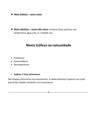 O documento discute a ecologia, incluindo como ela estuda as relações entre seres vivos e seu ambiente. Ele explica que a ecologia envolve populações, comunidades e ecossistemas, compostos por fatores bióticos e abióticos. Também descreve os níveis tróficos em comunidades, como produtores, consumidores e decompositores, e como cadeias alimentares mostram relações entre eles.