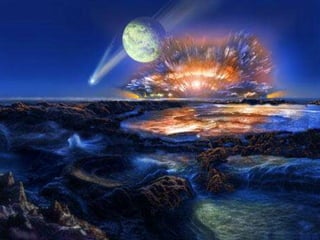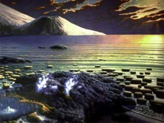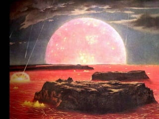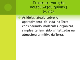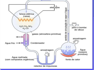 O documento discute a teoria da evolução química da vida, começando com moléculas orgânicas simples que teriam sido sintetizadas na atmosfera primitiva da Terra e evoluído gradualmente através de uma "sopa primordial". O experimento de Urey-Miller forneceu evidências experimentais para esta teoria ao sintetizar moléculas orgânicas básicas usando seu aparelho.