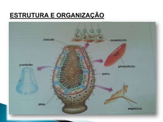 O documento descreve três grupos de animais sem vertebrados: esponjas, cnidários e platelmintos. As esponjas não possuem tecidos ou órgãos e vivem principalmente no mar. Os cnidários são aquáticos, possuem uma cavidade digestiva e apresentam formas pólipo e medusa. Os platelmintos como a planária têm corpo achatado e vivem em locais úmidos.