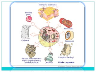 O documento descreve aspectos fundamentais da biologia celular, incluindo a teoria celular, os tipos de células e suas organelas. A biologia é o estudo da vida em seus diversos aspectos, e a teoria celular estabelece que todos os organismos são compostos por células, que as células nascem de outras células e guardam informações hereditárias. O documento também diferencia células procarióticas e eucarióticas.