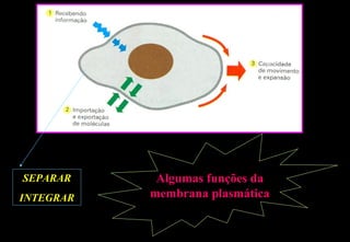 O documento descreve a estrutura e funções da membrana plasmática, incluindo sua composição lipídica e proteica, assim como especializações como microvilosidades, cílios e junções celulares. A membrana plasmática é formada por uma bicamada lipídica com proteínas embebidas, atuando como barreira seletiva entre o interior e exterior da célula.