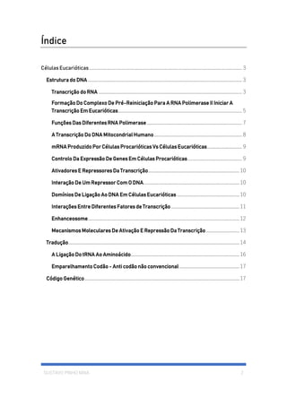 O documento resume os principais conceitos da biologia molecular e celular, incluindo a estrutura do DNA, a transcrição do RNA, as diferentes RNA polimerases, a transcrição do DNA mitocondrial, a diferença entre mRNA produzido por células procarióticas e eucarióticas, o controle da expressão gênica em procariotos e eucariotos, e os mecanismos moleculares de ativação e repressão da transcrição.