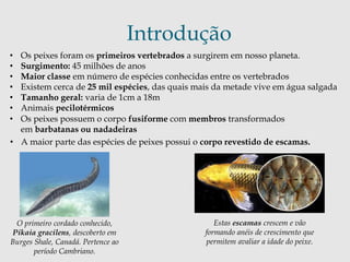 O documento descreve as principais características dos peixes, incluindo sua classificação, sistemas fisiológicos, hábitos de reprodução e importância para os seres humanos. Os peixes surgiram há 45 milhões de anos e são a maior classe de vertebrados, com cerca de 25 mil espécies vivendo em água doce e salgada. Eles podem ser classificados como ósseos ou cartilaginosos dependendo de sua estrutura esquelética.