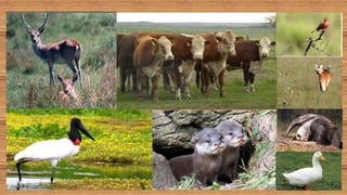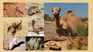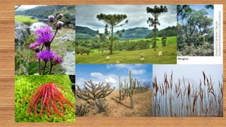 O documento aborda os biomas de campos, cerrado e desertos, destacando suas localizações, características, fauna e flora. Os campos são encontrados em várias regiões e possuem diversidade na vegetação, enquanto o cerrado é um bioma amplo com clima quente e biodiversidade notável. Os desertos, por sua vez, têm fauna e flora adaptadas à aridez, apresentando características específicas de clima e solo.
